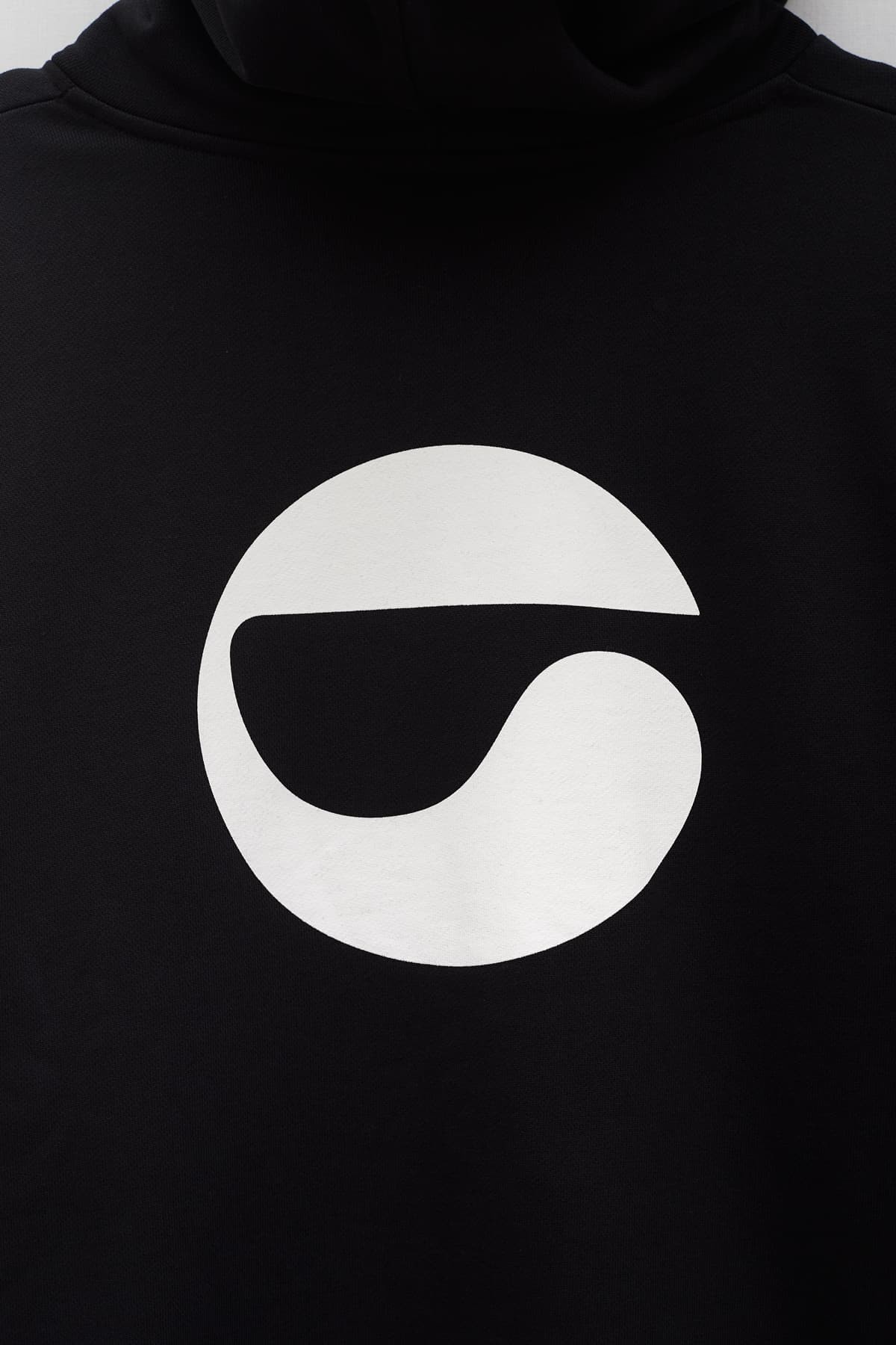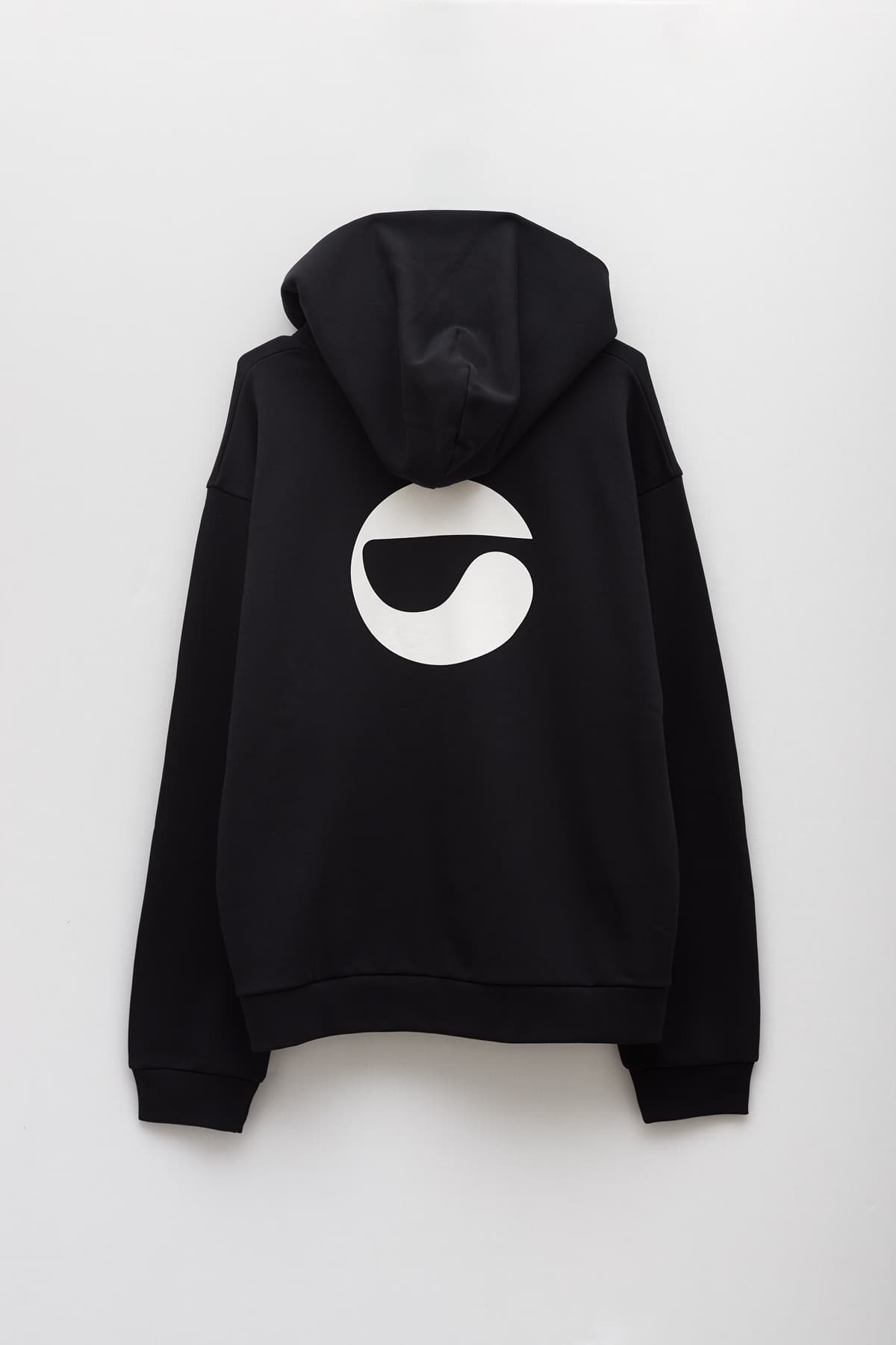 Coperni's white logo is on a black cotton hooded sweatshirt.