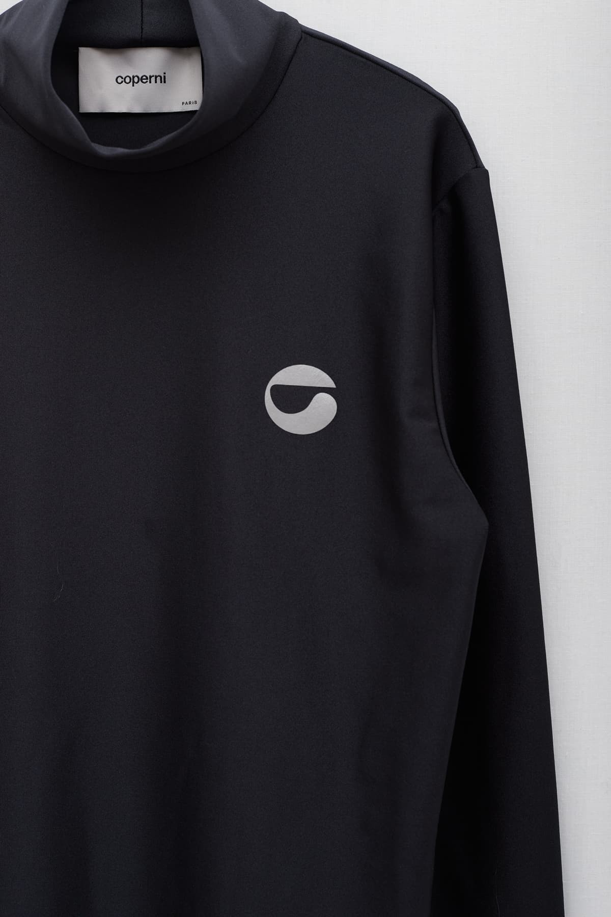 Fitted high-neck top. Long extended sleeves with thumb openings. Elastic. Futuristic style. Glossy and silky finish. Printed logo.