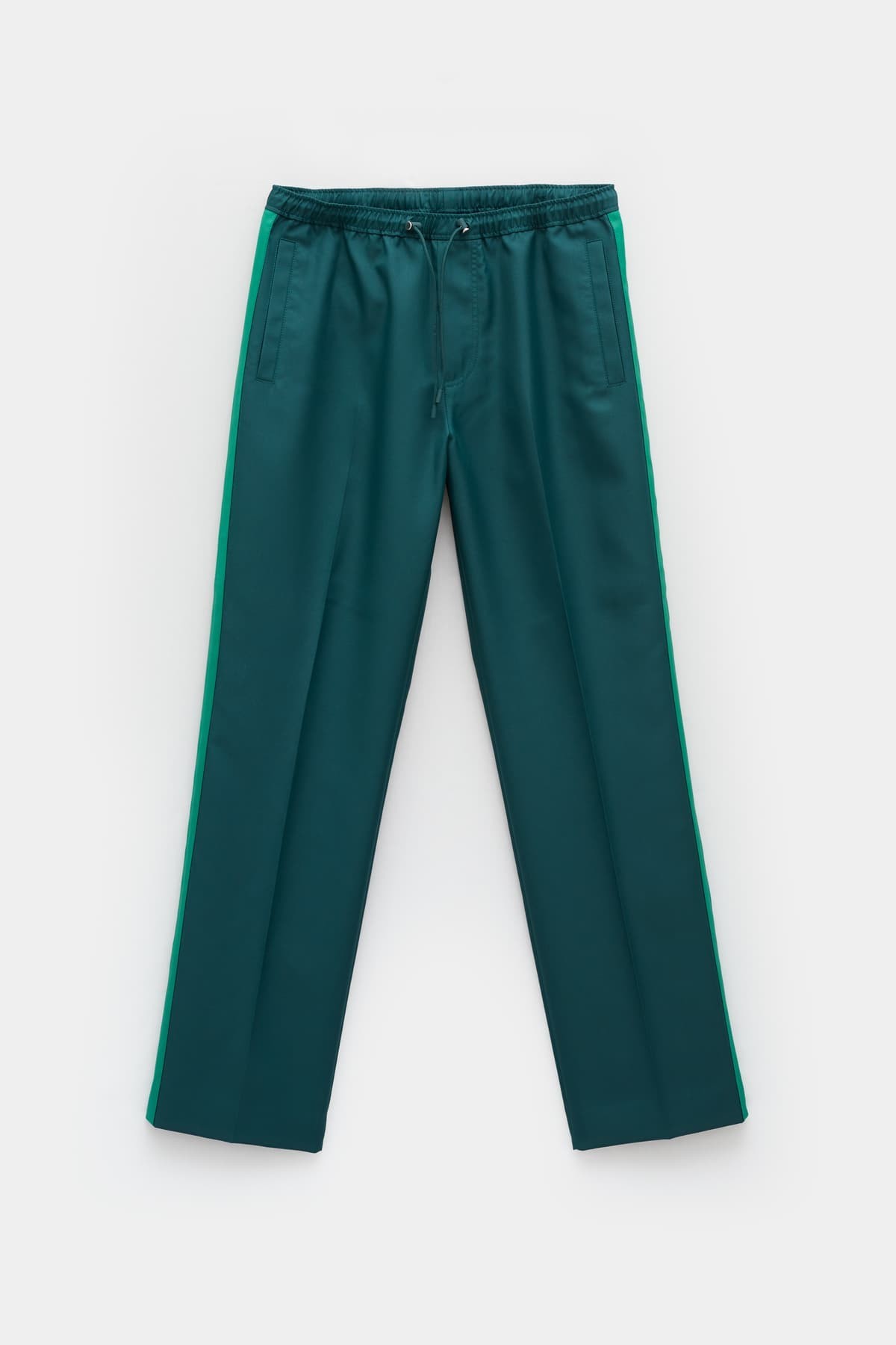Straight fit trousers. Adjustable elastic waistband with drawstrings. Back pocket with zipper.