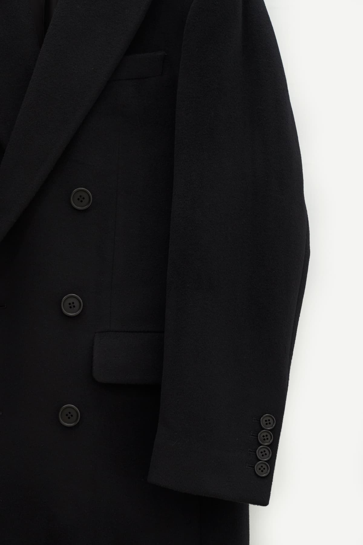 Classic long double-breasted coat. Italian wool and cashmere blend fabric. Front pockets, peak lapels and horn buttons. Viscose lining.