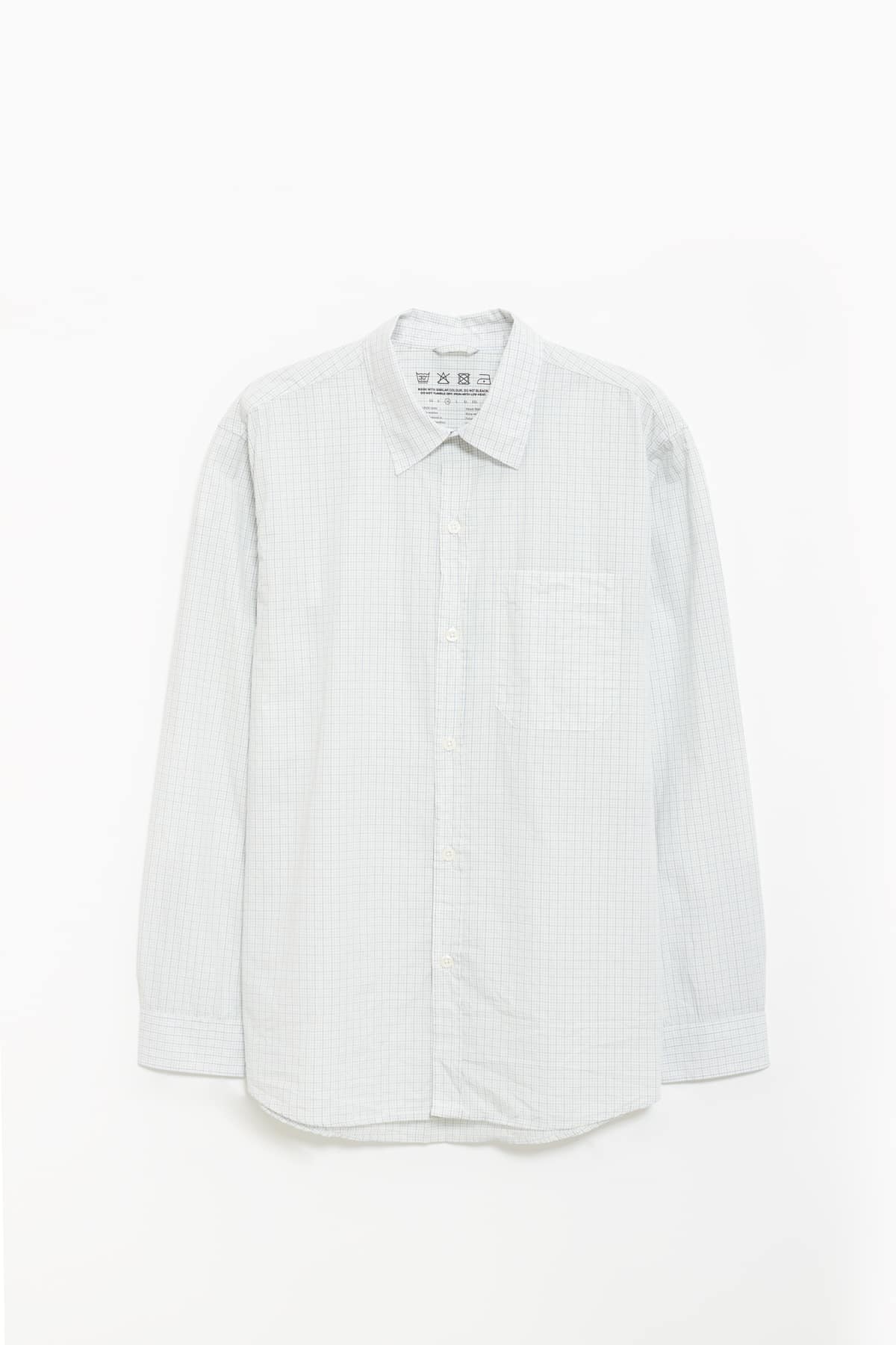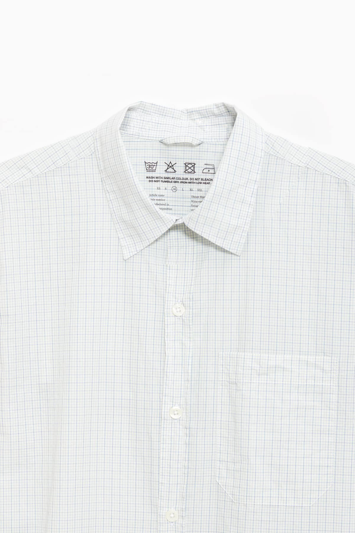 Regular fit shirt with fine blue check. 100% cotton. Front button placket and back yoke. Chest pocket. Cold wash.