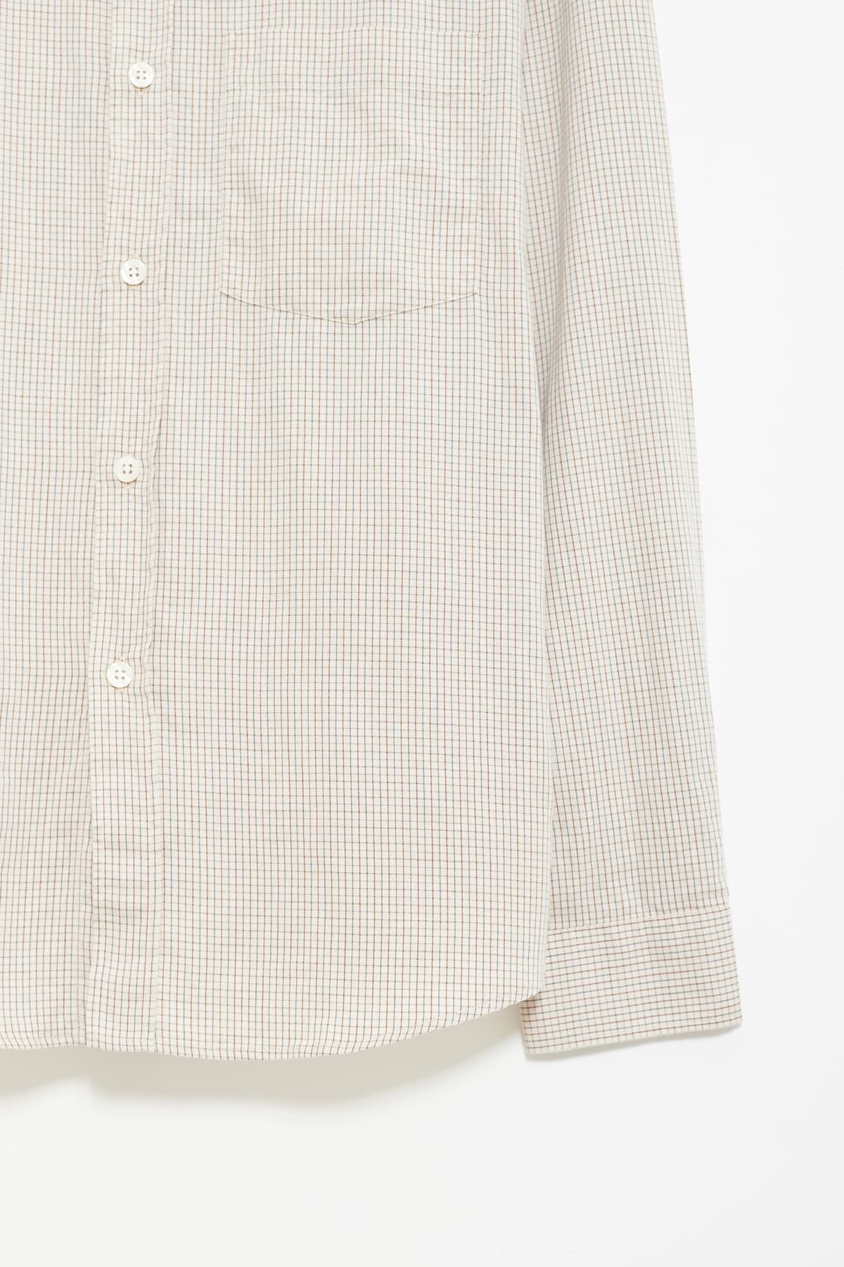 Relaxed fit shirt with grey and brown fine check. Cotton and merino wool. Button placket, spread collar, back yoke pleats and chest pocket. Cold wash.