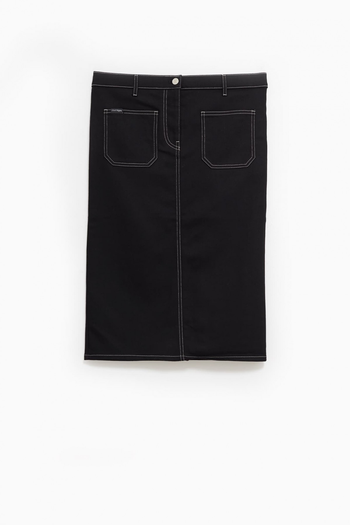 Topstitched straight denim midi skirt. Two patch pockets at front and back. AC logo on back pocket.