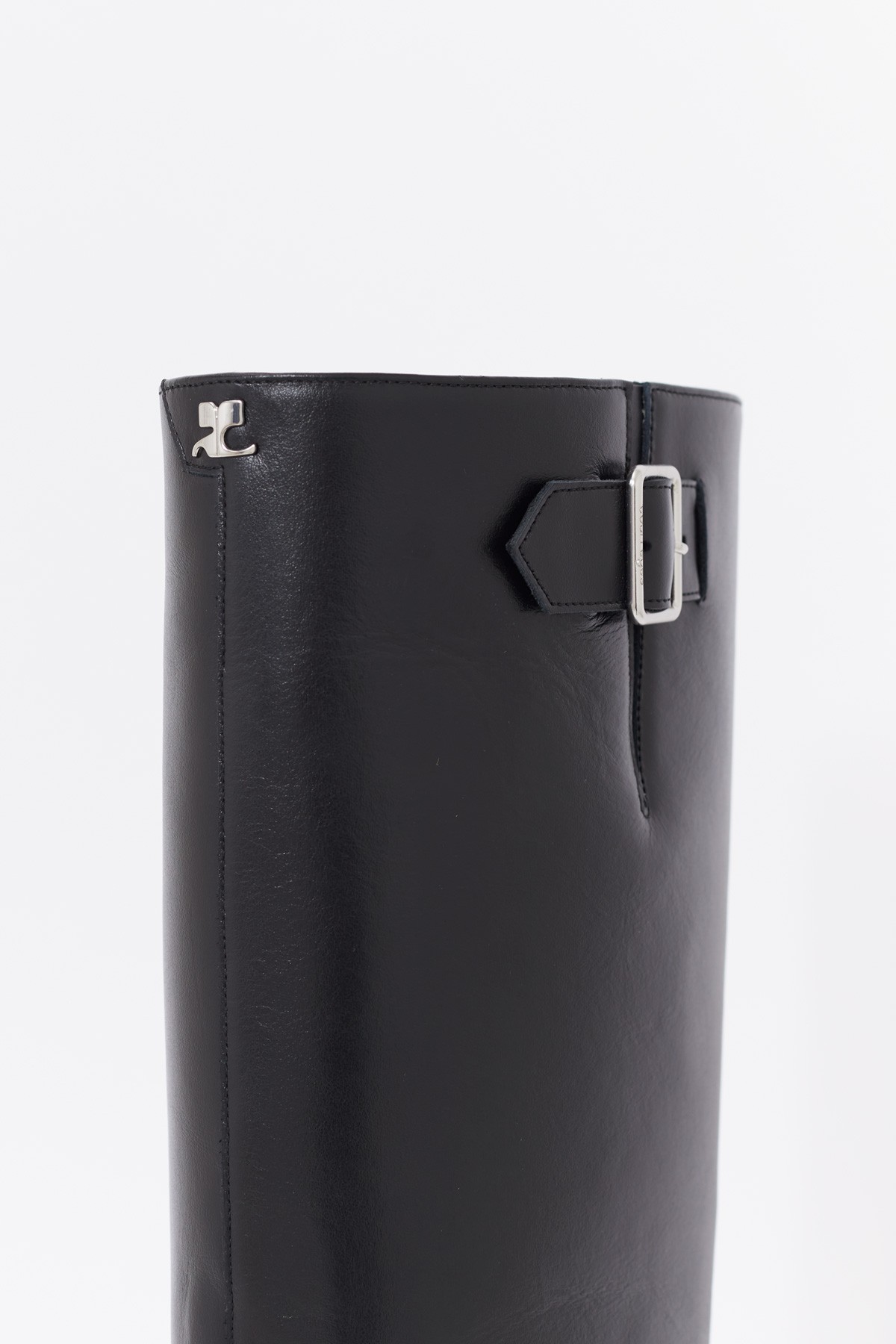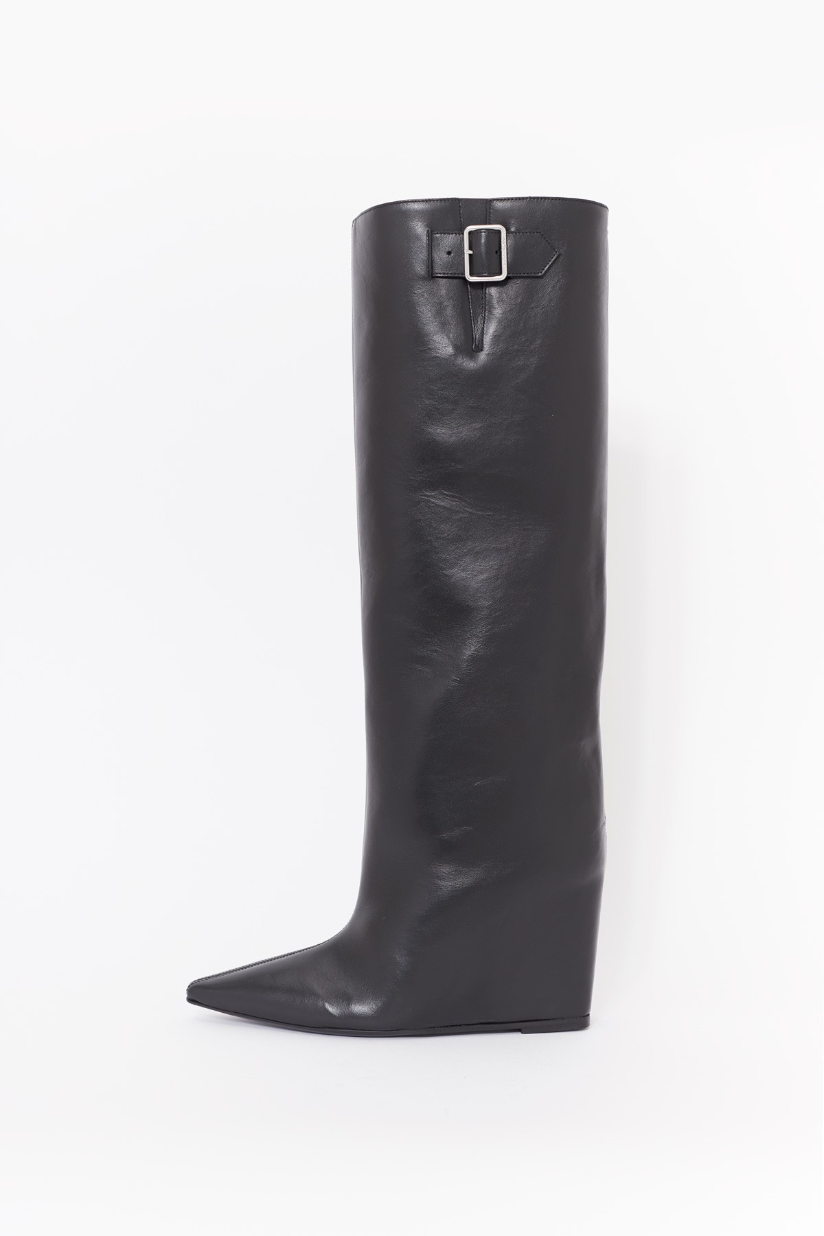 High leather boots with leather-covered wedge heel and pointed toe. 100% calf leather. Silver buckle and AC logo at top of shaft. Stem: 42 cm Heel: 9 cm