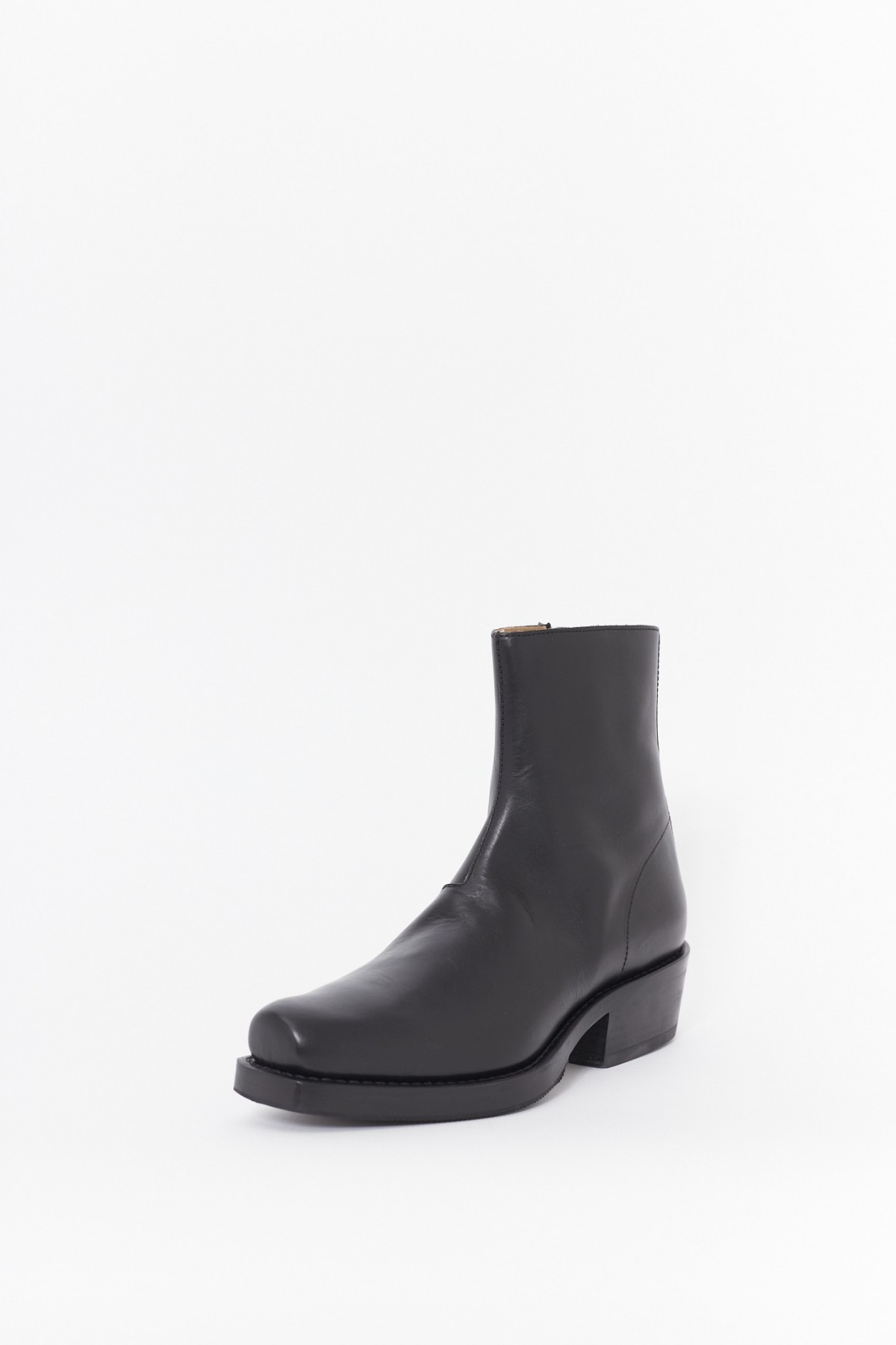 Black ankle boots in premium leather. Western style. Almond toe. Inner zip closure. Stacked leather cuban heel.