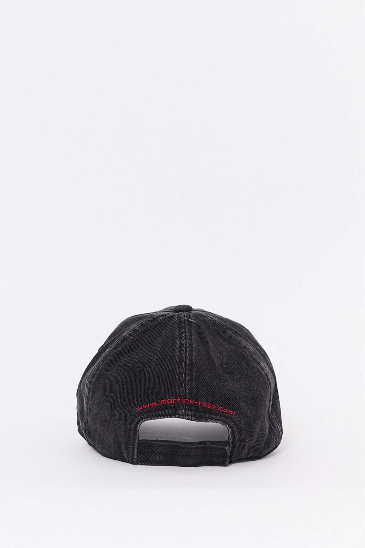 Distressed baseball cap. 100% cotton. Cut-off peak with frayed and torn edges. Seasonal artwork embroidered on the peak and screen-printed on the front panel.