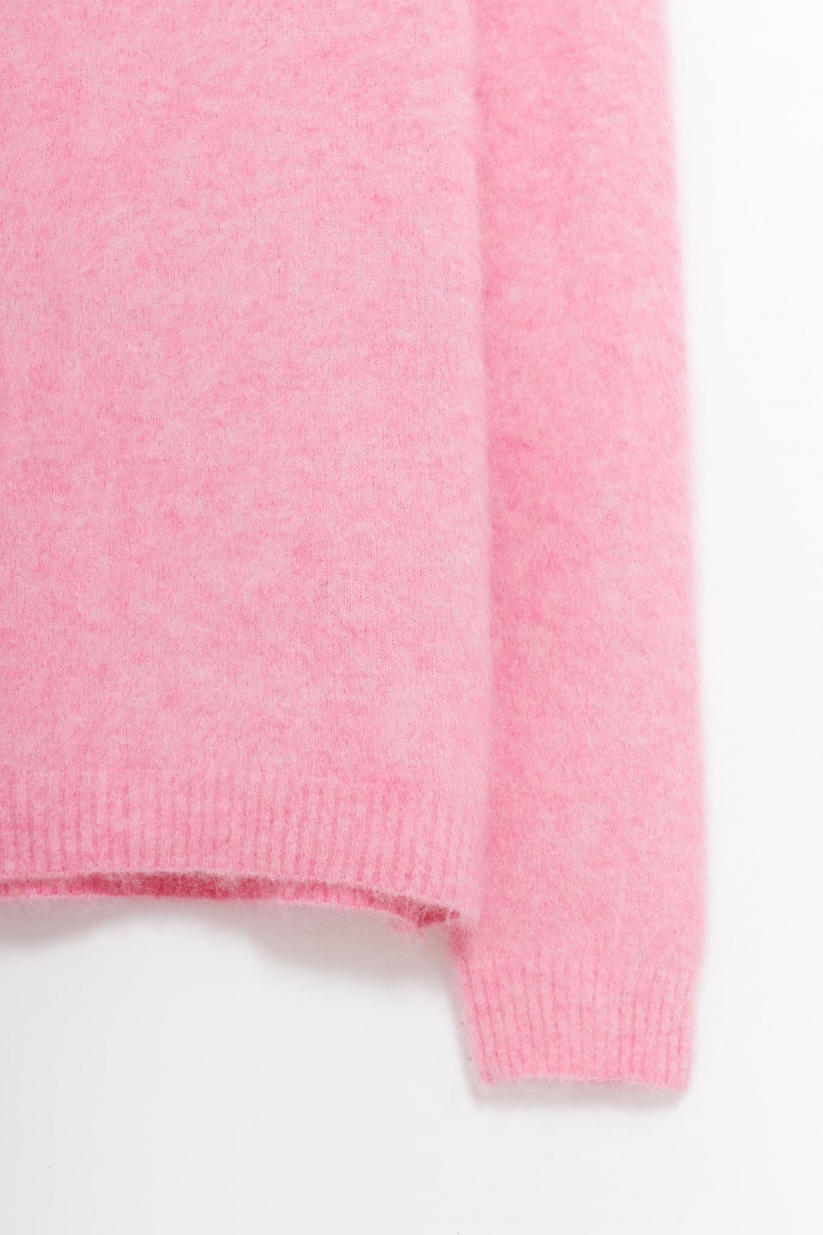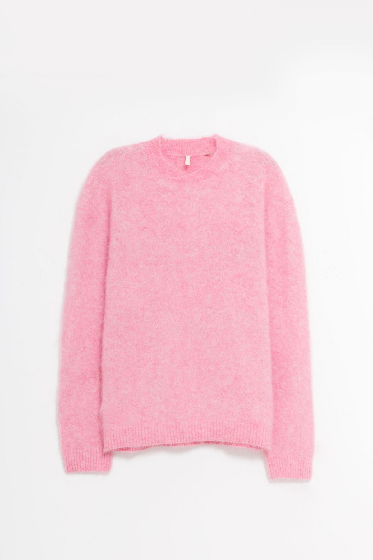 Relaxed fit sweater. Mohair and wool blend. Asymmetrical collar detail with front flap.