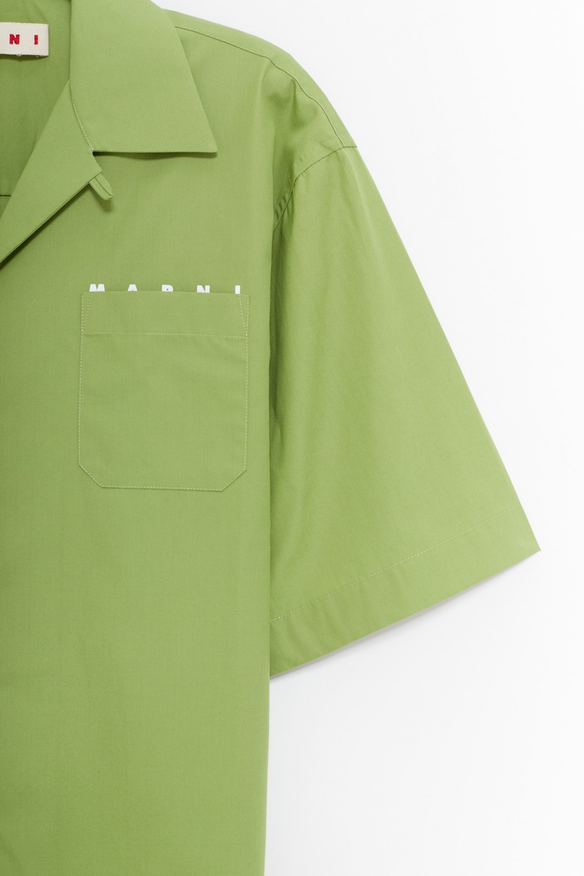 Bowling fit shirt. Short sleeves. Organic cotton poplin. Logo on the chest. Mother of pearl button closure.