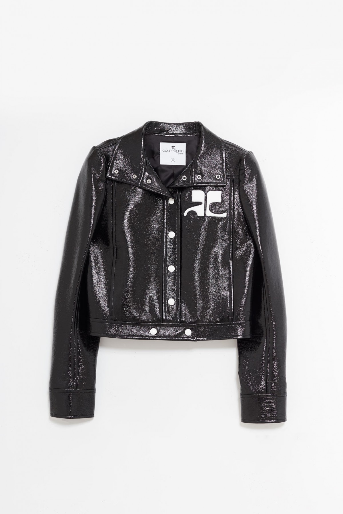 Cazadora vinilo ceñida. Diseñada para llevar abierta. Dos bolsillos laterales. Logo AC blanco en el pecho. Forrada. Cierre de botones a presión en la parte delantera central y en los puños.